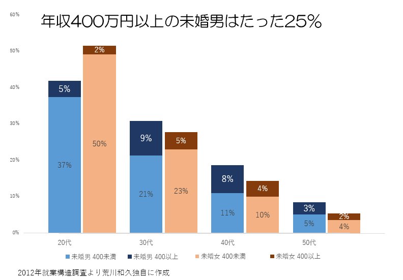 と婚活現場で言うのは自由ですが、400万円以上稼ぐ未婚男性なんてのはたった25%しかいません。